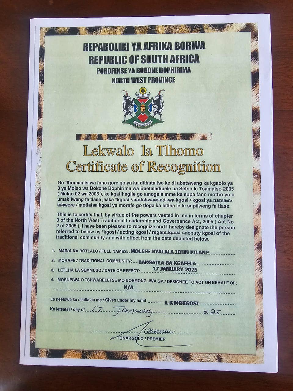 Bakgatla Ba Kgafela Royal Family in Moruleng has formally welcomed the reinstatement and recognition of Kgosi Nyalala Pilane as the legitimate traditional leader of the community. This decision, made by North West Premier Lazarus Mokgosi on 17 January 202...