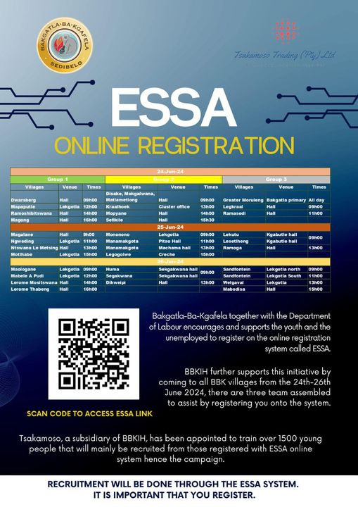 Bakgatla-Ba-Kgafela together with Department of Labour encourages and supports the youth to register on the online registration system called ESSA. Click on the link below;https://essa.labour.gov.za/EssaOnline/WebBeans/BBKIH further supports this initiati...